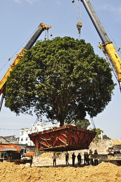20名作業(yè)人員,連續(xù)一周的緊張工作,40余萬元搬家費用。2014年10月23日上午12時10分,在兩臺大型起重機巨臂的牽引下,總重達(dá)62噸的“桂花王”連同底部的箱梁緩緩落入預(yù)定的坑穴,岳西縣城居民廣泛關(guān)注的“桂花王”順利移動60余米,成功入住新家。