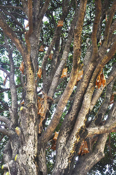 從10月15日開始開挖,到今天成功搬家,再到下一步的“生根發(fā)芽”,如何確保這棵桂花王順利適應(yīng)新環(huán)境?來自四川農(nóng)大的碩士王天龍介紹,從15日開始,技術(shù)人員定期往樹葉上噴灑抑制蒸騰劑,以減少水分蒸發(fā)。同時使用營業(yè)液為枝干補充能量!澳壳拔覀兪褂玫臓I養(yǎng)液已經(jīng)超過300公斤,你看樹干上一袋袋,掛的都是營養(yǎng)液。”王天龍笑著說。