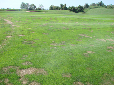 夏季斑是典型的根部病害,根系先感病,則植株不長,導致感病區(qū)出現(xiàn)凹陷的草圈,并逐漸枯死。