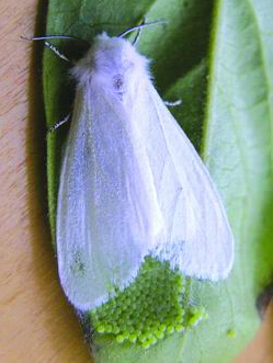 成蟲 白色中型蛾子,體長13—15mm。復(fù)眼黑褐色,口器短而纖細(xì);胸部背面密布白色,多數(shù)個(gè)體腹部白色,無斑點(diǎn),少數(shù)個(gè)體腹部黃色,上有黑點(diǎn)。雄成蟲觸角黑色,櫛齒狀;翅展23-34mm,前翅散生黑褐色小斑點(diǎn)。雌成蟲觸角褐色,鋸齒狀;翅展33—44mm,前翅純白色,后翅通常為純白色。